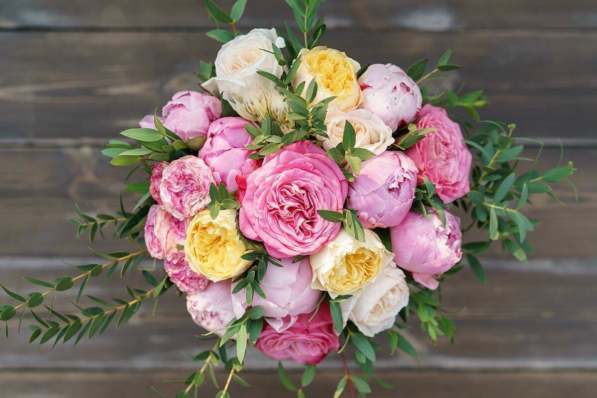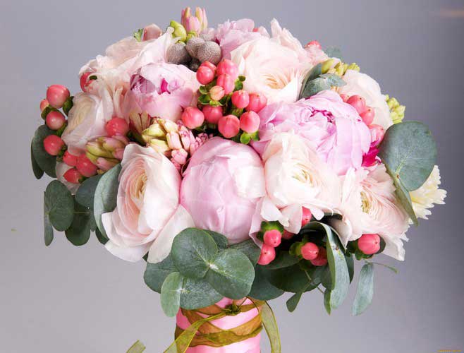 Пионы идеально смотрятся в букетах из монокомпозиций, а также превосходно позволяют дополнить их иными видами цветов: пионовидными розочками, гортензиями, суккулентами и ранункулюсами.